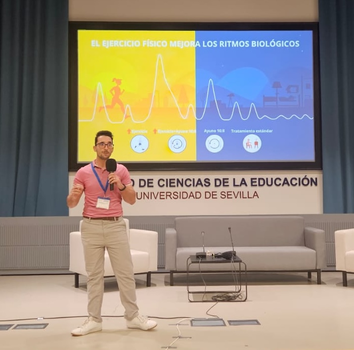 Marcos Molina presentó el trabajo titulado “Changes in rest-activity rhythm amplitude after a 12-week time-restricted eating and supervised exercise intervention in adults with obesity: preliminary results of the TEMPUS randomized controlled trial”, mientras que Javier Sánchez expuso “The effects of a 24-week resistance exercise program on Alzheimer’s disease gray matter diffusivity signature in cognitively normal older adults: Preliminary results of the AGUEDA trial”.